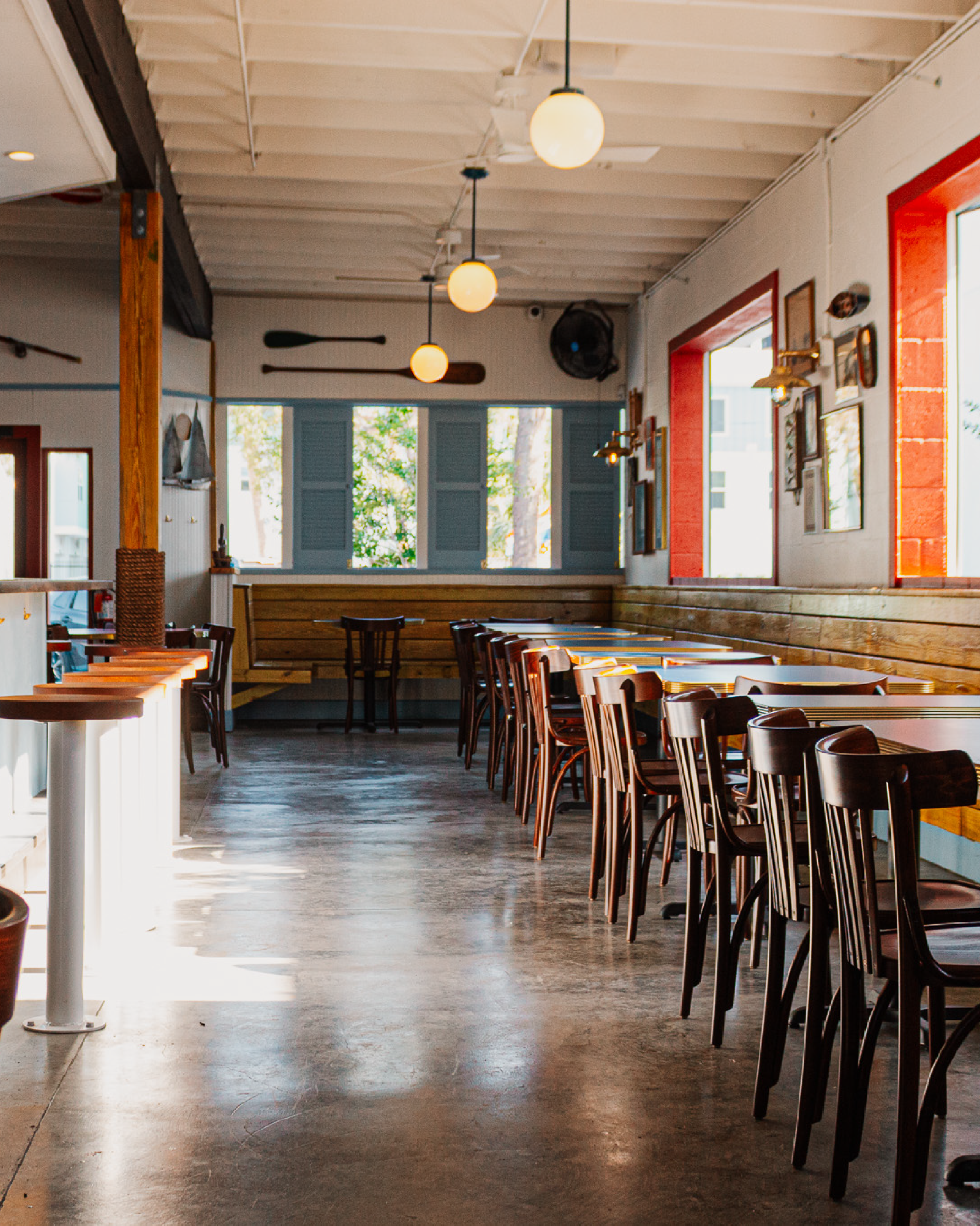 Our easy, breezy space is comprised of a light-filled room with a classic wooden horseshoe bar and wrap-around banquette seating.